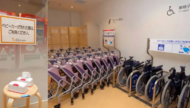 ↑為帶孩子和身體狀況不佳的顧客準備的嬰兒車和輪椅設置于大門的入口附近,下車即可利用,最大限地減輕特殊顧客的體力負擔。旁邊放著消毒紙巾,用于擦拭嬰兒車。